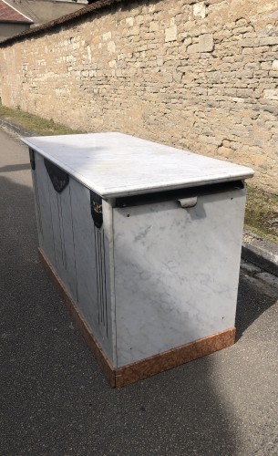Ancien meuble comptoir de boulangerie. Acheté en 1930 à la foire de Lyon par la grand mère de son dernier propriétaire. Les plaques de marbres sont vissées sur un solide chassis métallique. Marbre blanc veiné, plinthes marbre ocre. Décor gravé. Typique de l'époque art déco. Plateau marbre épais. Parfait état. Deux grands plateaux métalliques coulissants sur les cotés. Un tiroir avec coupe-pain. Un tiroir caisse à combinaison avec sonnerie. Trois autres tiroirs et une étagère de rangement. Marque du fabricant diffilement lisible. Dimensions: 152 X 71 cm. Hauteur 92 cm.
