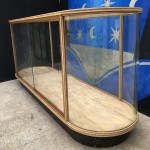 Ancien grand comptoir vitrine de magasin. Meuble de milieu, toutes faces vitrées. Chêne naturel, les deux extrémités en verre bombé. Plinthe en marbre noir. Ouvre par deux portes coulissantes. Dimensions 2 mètres de longueur, 60 cm de profondeur, 91 cm de hauteur.