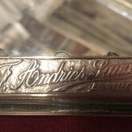 Ancienne vitrine de comptoir de magasin. Verre bombé et laiton. Intérieur miroir (état d'usage). Ouverture par une serrure à clé (présente) située en dessous. Plaque du fabricant "F. Andries Laux (?) Bruxelles". Dimensions: 95 X 31,5 cm. Hauteur 10,5 cm.