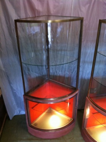 Paire de vitrine en quart de rond, en bois peint, laiton et verre bombé. La partie basse ouvre par l'avant, elle est éclairée et possède une tablette. La partie supérieure ouvre par une porte latérale, possède une ou deux tablettes. Hauteur 182 cms, Les cotés font 60 cms de longueur.